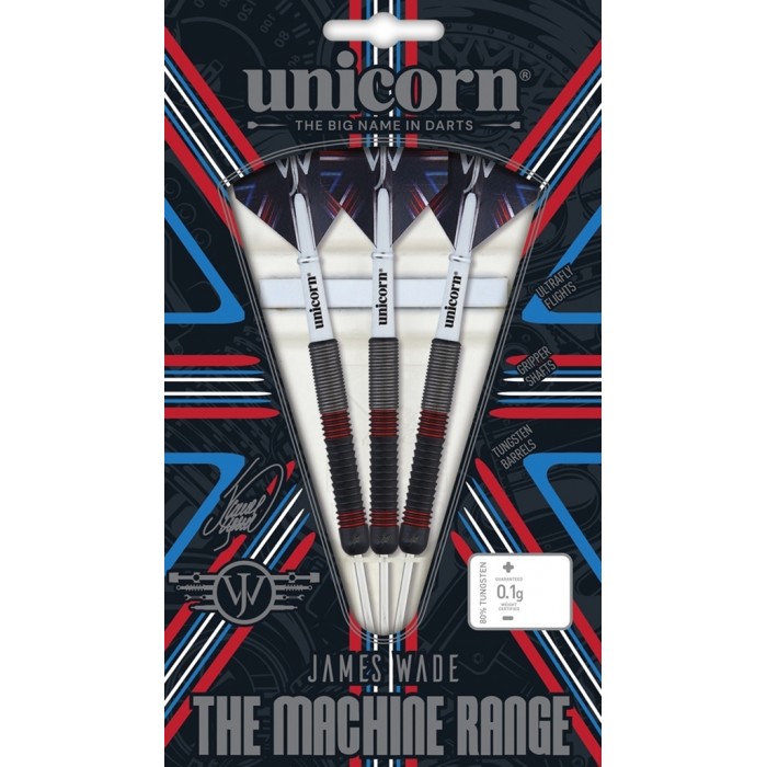 The Machine Range is a collection of darts in a variety of shapes styles and sizes offering a number of options for fans of The Machine. Each set comes with James Wades Ultrafly flights Gripper shafts and Unicorns incredible volute points - which offer incredible grip in the board without leaving any damage to the sisal. 80% coated Black Titanium Nitride Tungsten barrels with red rings James Wade Ultrafly Flights Gripper Shafts Volute Points Guaranteed Weight Certified ?0.1g Engraved Unicorn Hallmark |